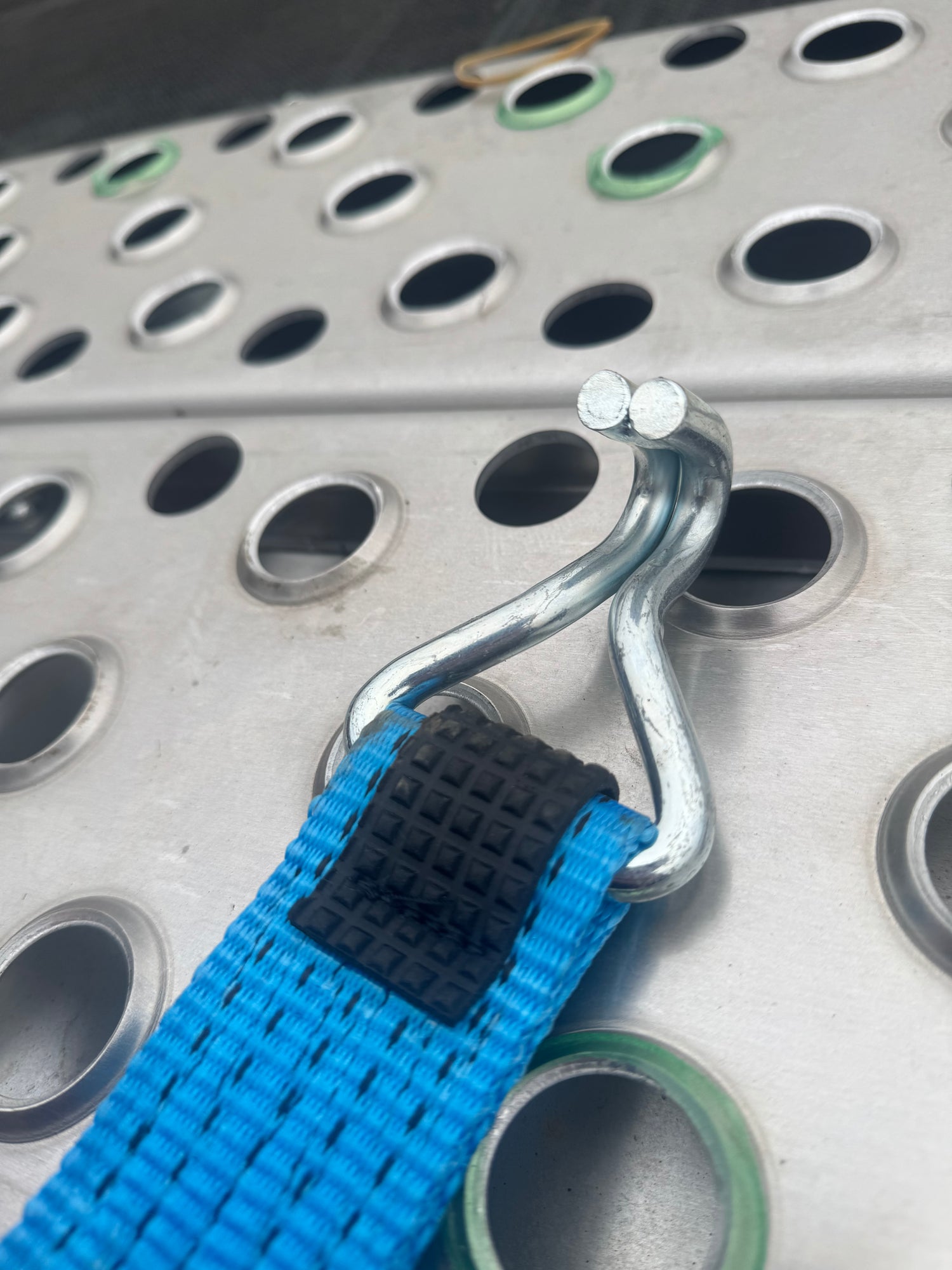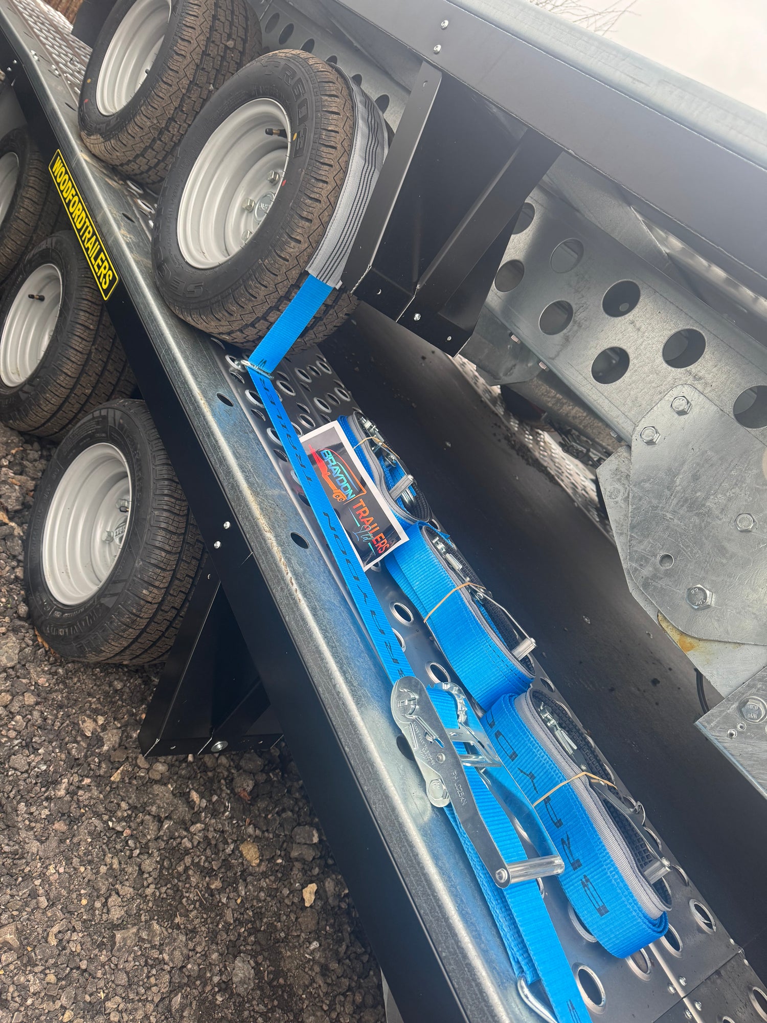 Transport with confidence using this high-quality over-wheel ratchet strap. Featuring a durable blue strap with a grey protective sleeve, this strap is designed for reliability and longevity, making it ideal for securing your vehicle during transit.